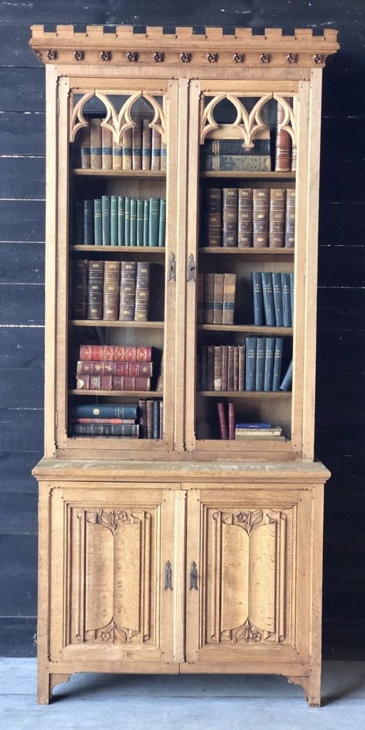 An unusual 19th Century antique Gothic bookcase, made from oak and we have bleached it for a modern look but could be waxed to any colour or shade desired.