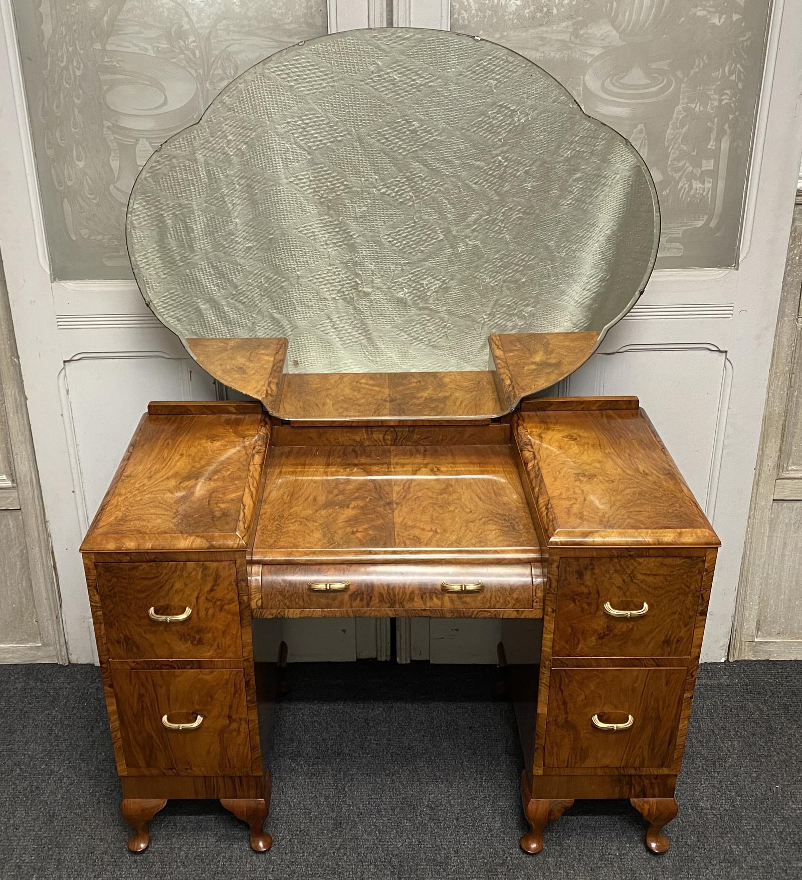 A very stylish original Art Deco Dressing Table. Very high quality as can be seen from the dovetails and bears a label to the drawer. Made from Walnut with nice Burr Walnut. All the drawers run smoothly fitted with original art deco handles. The original mirror has a rake adjusment and is in good condition.