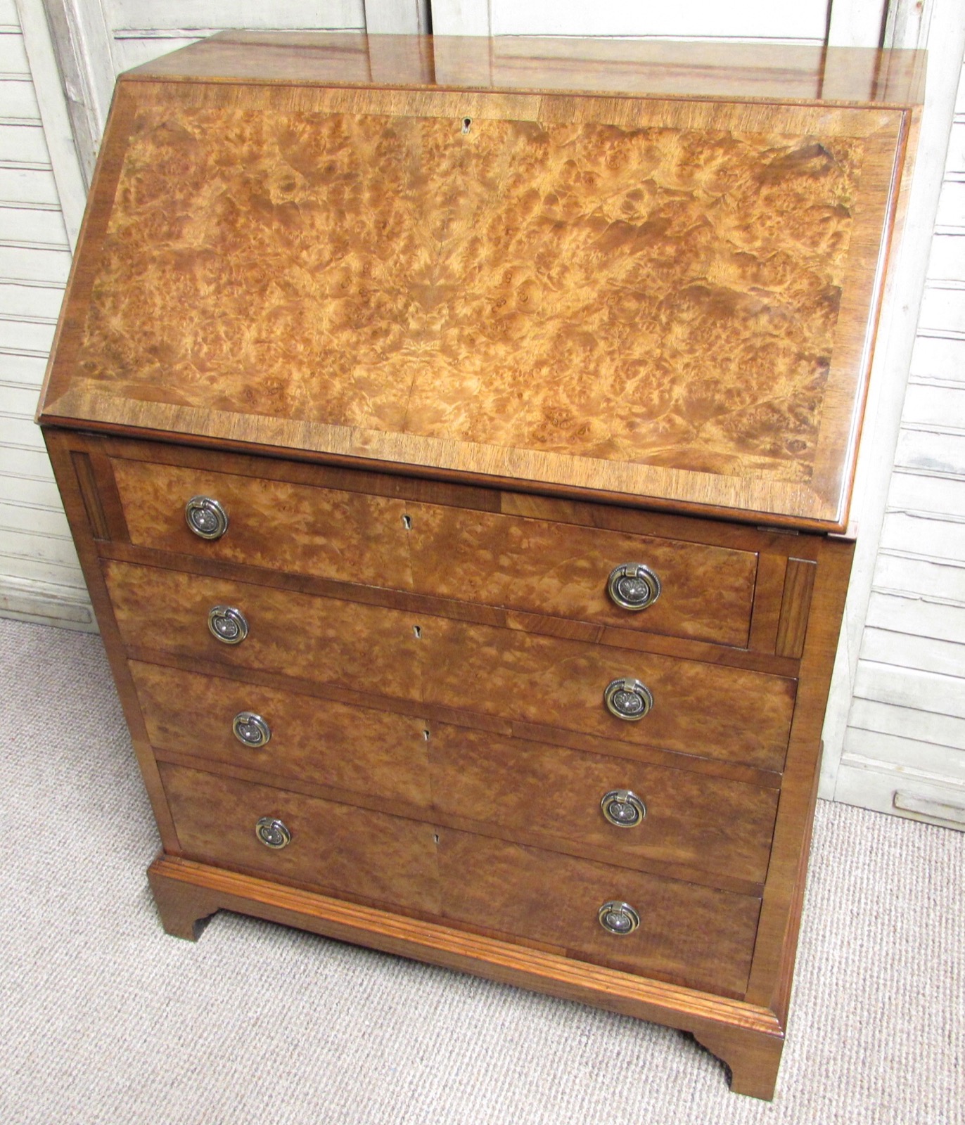A lovely Edwardian Bureau Desk, made from Walnut with superb Burr Walnut to the fronts and top. The lockable (key present) fall drops down and the 2 support lopers automatically come forward. Inside are 2 drawers and a lockable (key present) little cubby hole. All the drawers under run smoothly and a sign of quality all mahogany lined, fitted with ring brass handles. As I said this really is the top quality of the era and would have come from a good retailer such as Maple & Co.