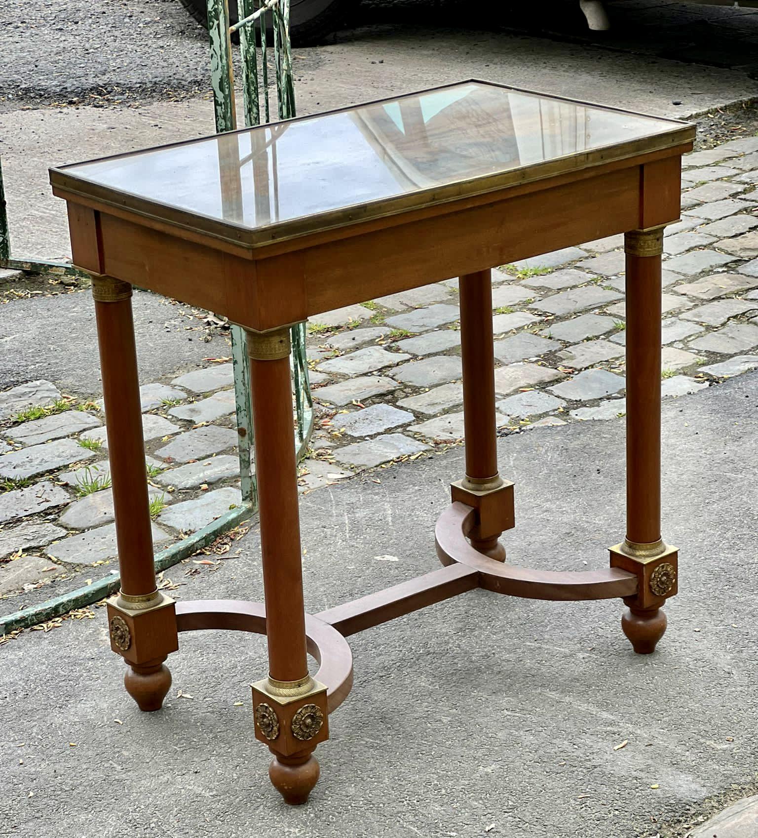 This is a superb 'French Empire style' console, lamp or pier table, made from mahogany with good quality brass mounts and embellishments. It has an inset glass top. Fee watermarks on the top but in overall very good original condition.