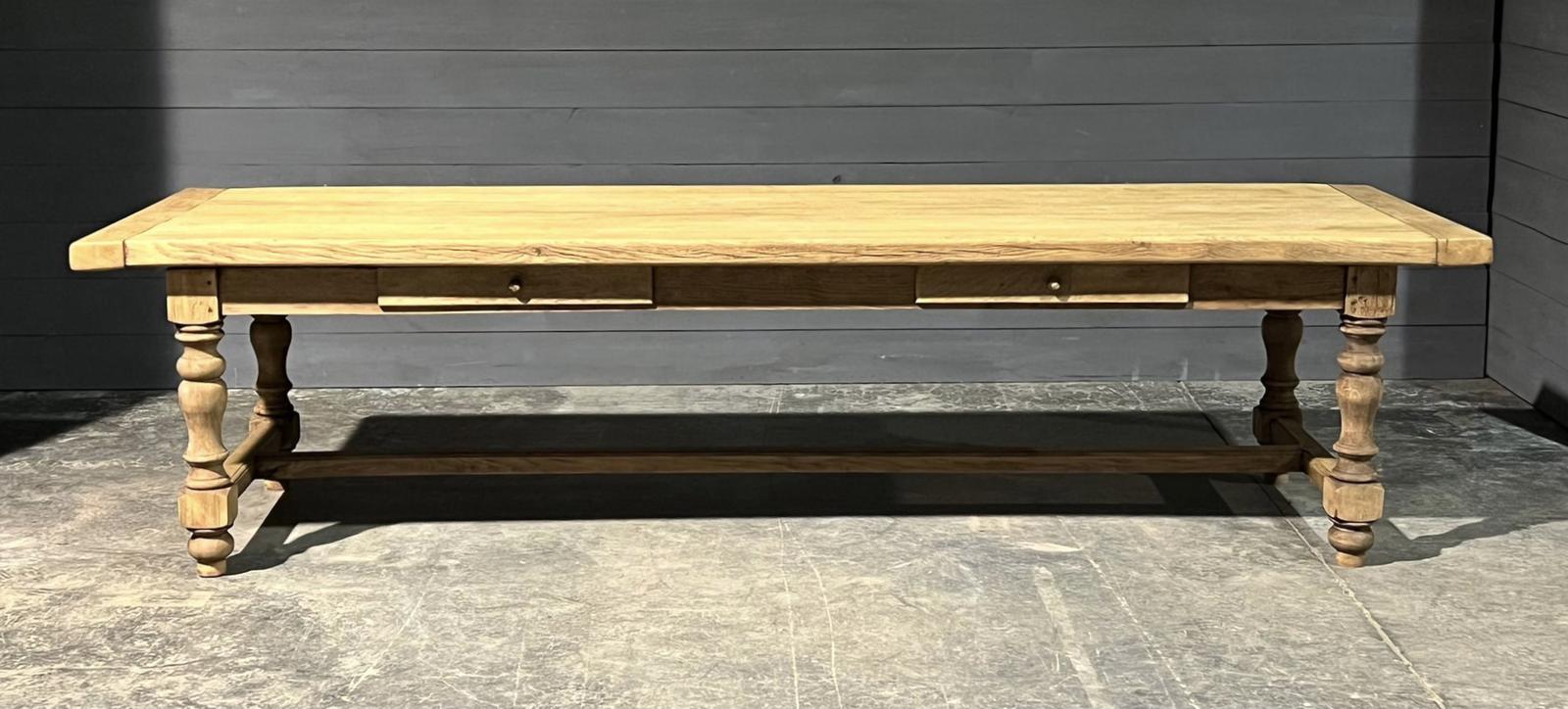 This is an absolutely magnificent and huge French farmhouse refectory dining table, made from solid oak and the top weighs a tonne! Having 2 drawers in one long side and the knee clearance is good at 61cm. Dating from the mid to late 19th Century and of excellent quality construction with all pegged joints.