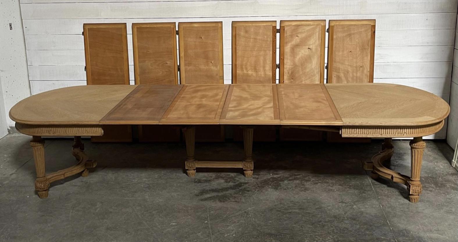A vast French Dining Table made from Oak and dating to around the late 19th / early 20th Century. The table is solid Oak which we have bleached and is very heavy, you can then pull apart the 2 ends and insert any number of leaves required (up to 7 meters fully open). The leaves are original but note they are oak frame with plywood centre. The runners run smoothly and are strong and sturdy.