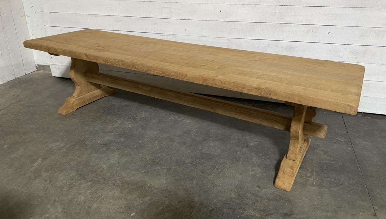 A wonderful and large Solid Oak Farmhouse Refectory Dining Table. French in origin and dating to the early 1900s. Made of solid Oak which we have bleached for a lighter look, the top is 6.5 cm thick and weighs a tonne. Luckily it comes apart for entry into the home. Also of excellent quality construction this table will be around for generations to come. In excellent original condition.