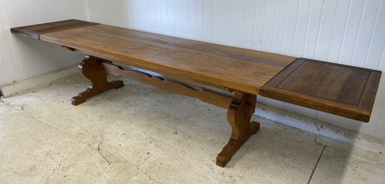 A stunning huge Farmhouse Refectory Dining Table, French in origin and made from solid Oak in the later part of the 19th Century. We have never seen one with the original extensions so a very rare table indeed.