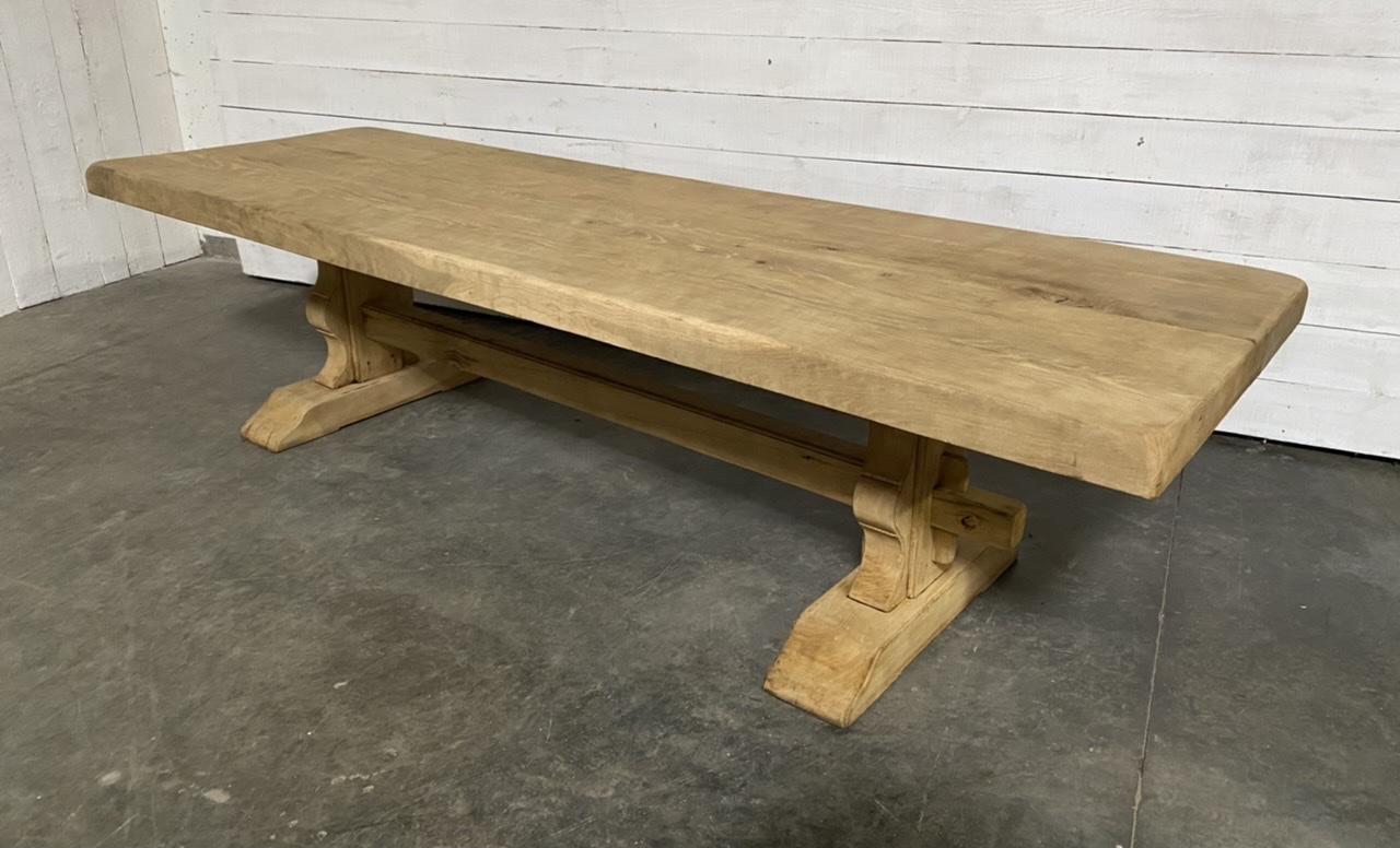 I often describe these tables as huge but this one is a behemoth! It's not only 3M long but also deep at nearly 1M which is impossible to find. Lastly the end overhang at 50cm is unheard of. So, its French in origin and made from Solid Oak, the top is an incredible 9cm thick and weighs a tonne. The legs also have a really decent amount of Oak and are chunky and heavy, luckily it comes apart for access into the home. It's of fabulous quality construction and will be around for generations to come, we have bleached it for a lighter look.