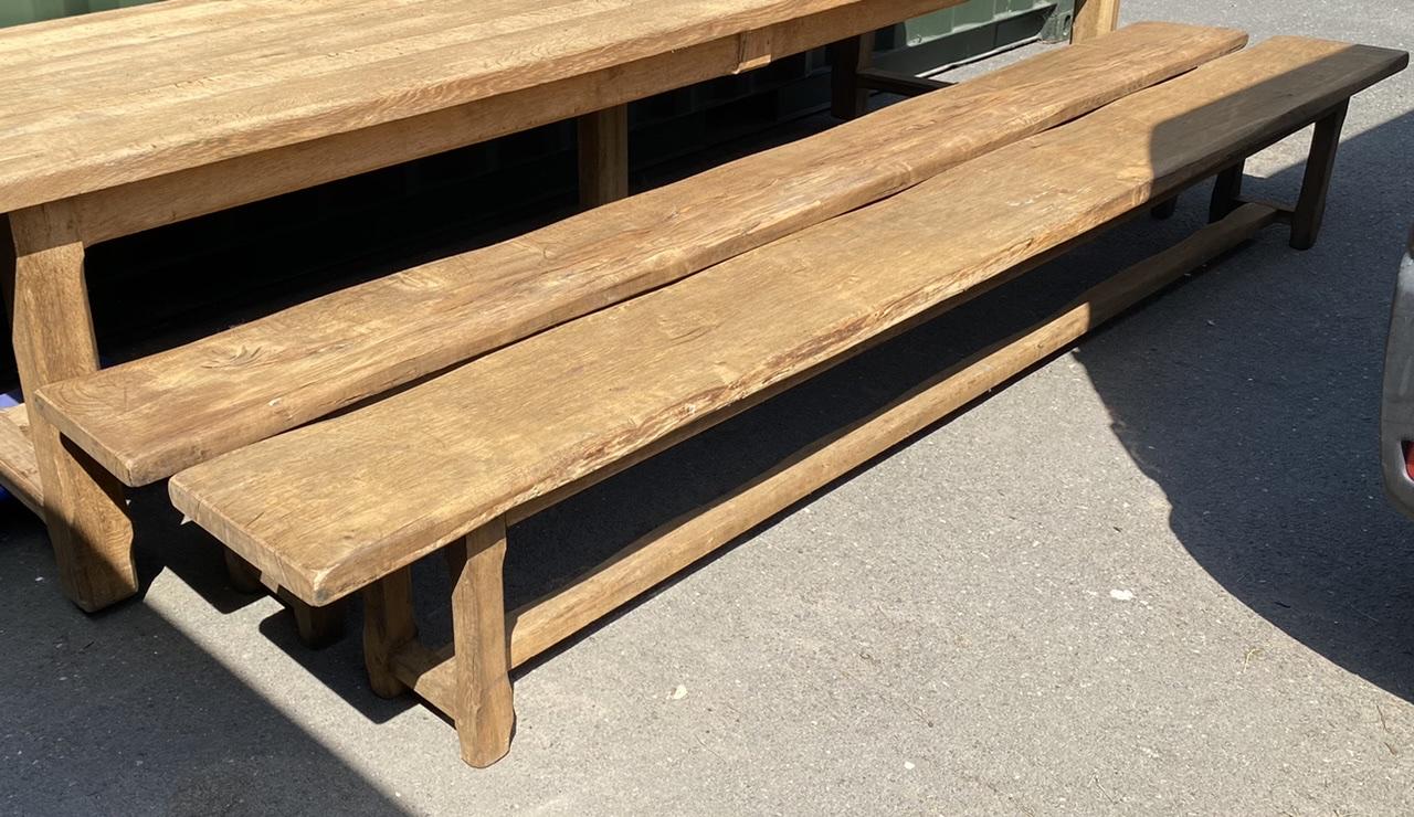 A fabulous Pair of French solid Oak Dining Benches, Huge at 335 cm long and unlike a lot of benches a good seating depth too. They match the superb table we also have listed. Made of solid oak and very heavy we have bleached them for a lighter look and to bring out the beauty of the natural wood. In excellent original condition for the home.