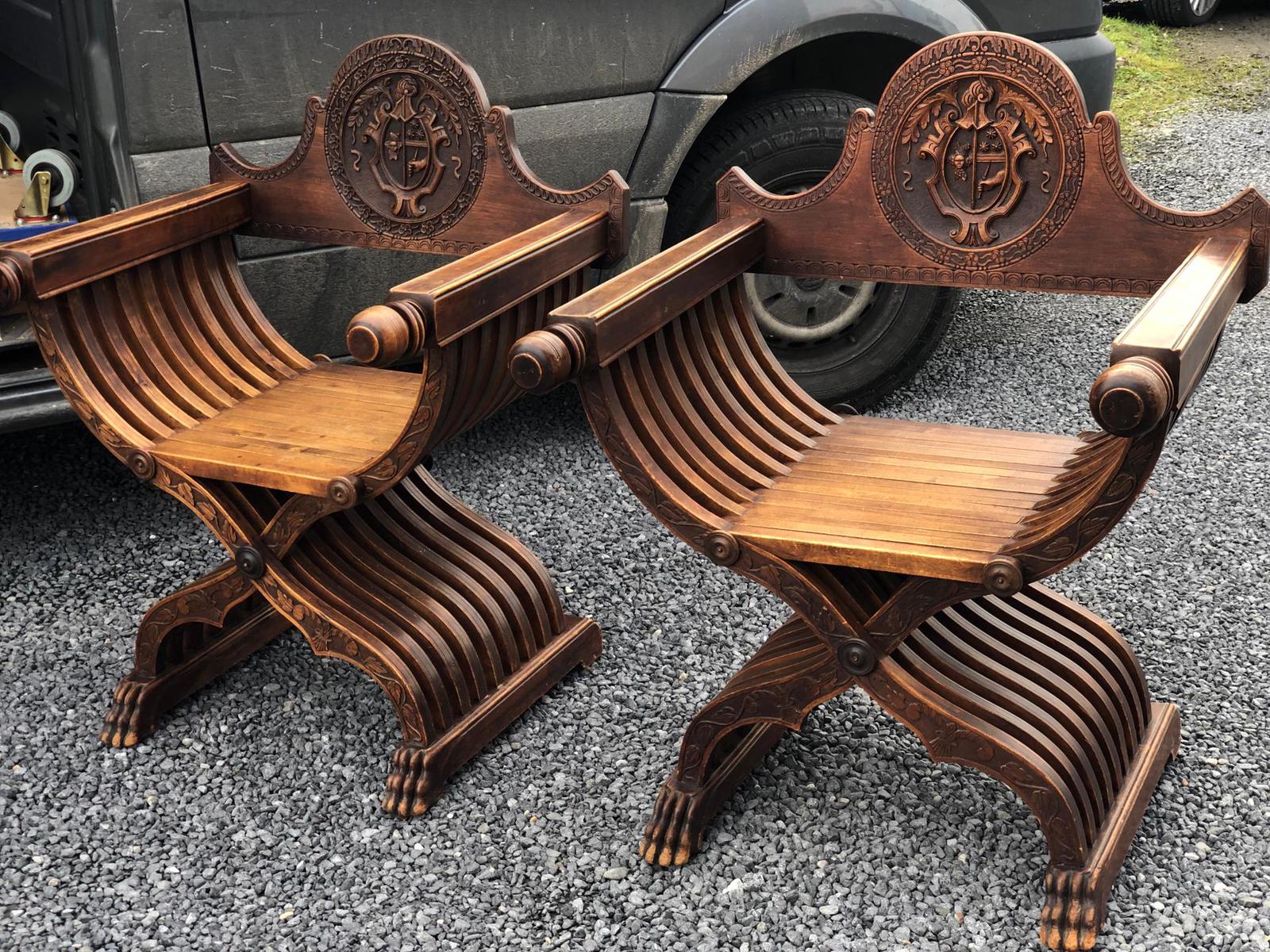 These are the best Savonarola chairs I have ever seen, made from solid Walnut and Italian in origin dating to around 1880. Larger than the usual Savonarola chairs and of excellent quality, nice armorial crests carved to the back rails. All they need is a couple squab cushions for a very stylish pair of chairs.