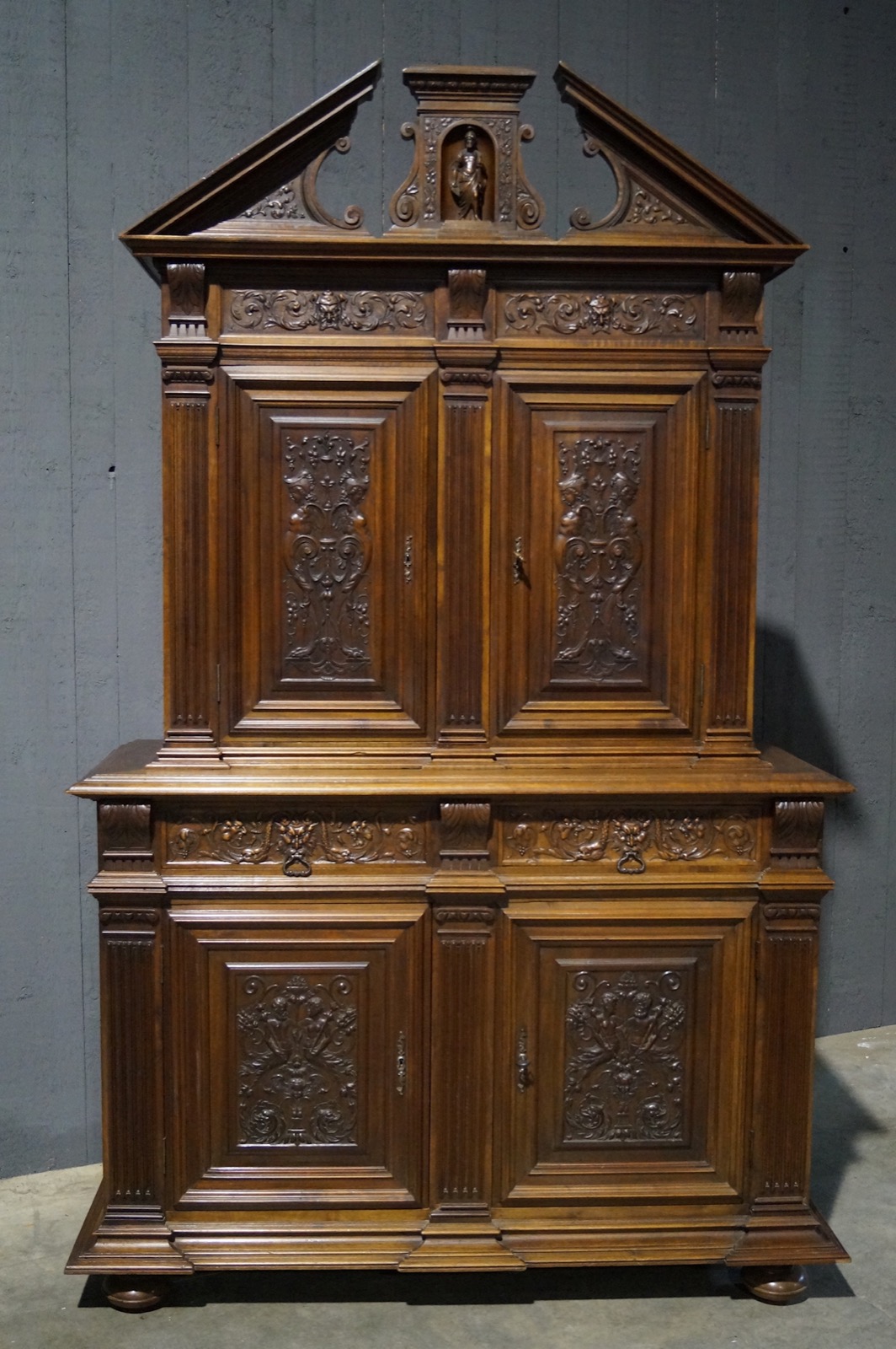 A superb quality very impressive large French cabinet or cupboard made from solid walnut and having 4 lockable doors (key present) and 2 drawers. The carved panels and detailing is crisp and very well executed.