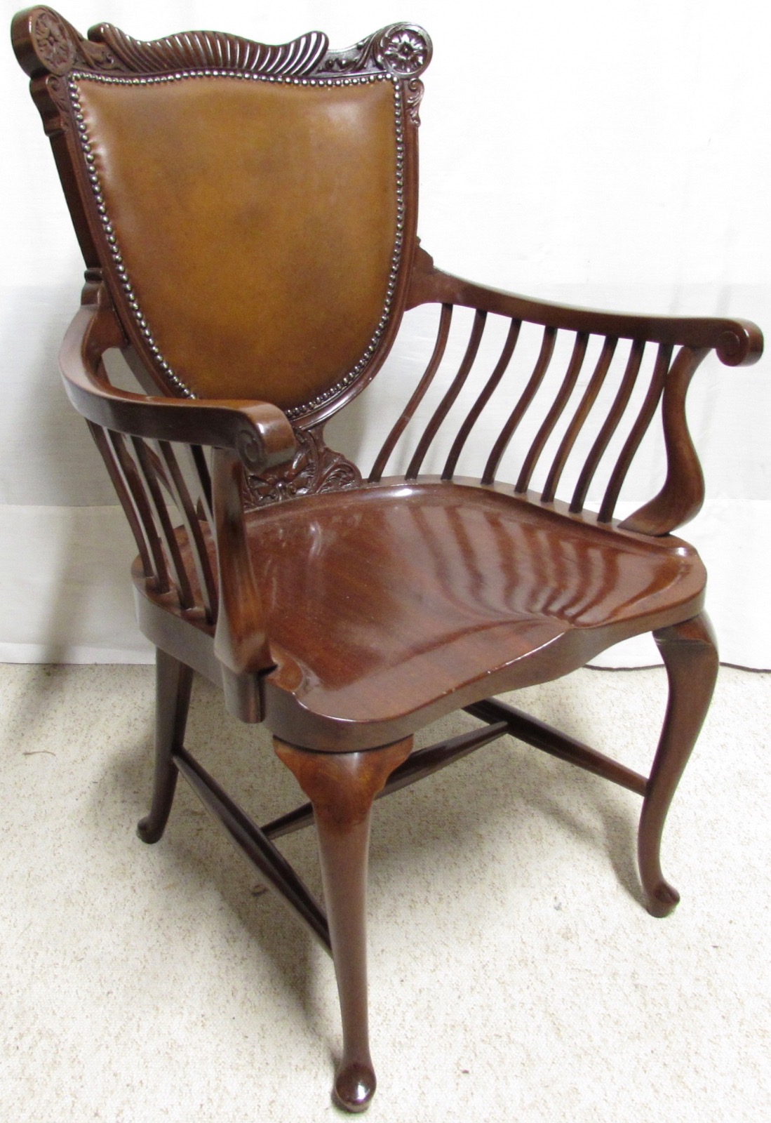 A generously proportioned, excellent quality Victorian Office or Desk Chair, made from solid Mahogany with leather padded back. This chair is very comfortable having shaped scalloped out seat and a padded back with replacement brown leather. It has a real gentleman's feel generous on size and imposing in nature. Very good quality manufacturer and nice carved detailing lead to a good looking chair. We have fully restored this to a high standard so ready for use.