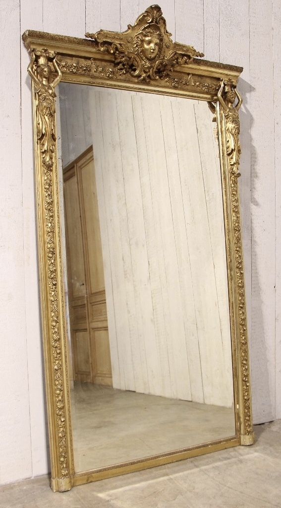 This is a superb large gilt mirror, French in origin, made from carved wood, Gesso and gilded. Lovely quality, the pair of maidens to either side really stand out as does the crest. The bevelled plate mirror is in excellent condition.