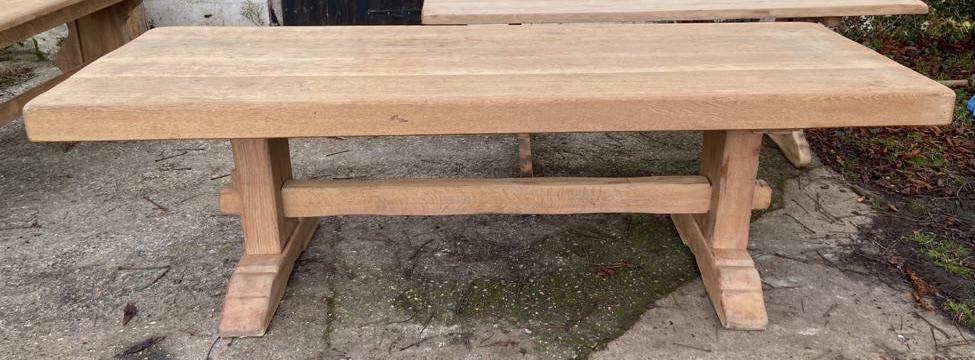 A large Farmhouse Refectory French Dining Table. Made from Oak which we have bleached for a lighter look. This is a good quality Table that will last for generations to come. Made in the early 1900’s. The top lifts off and the base knocks apart into 3 pieces for easy access into the home.