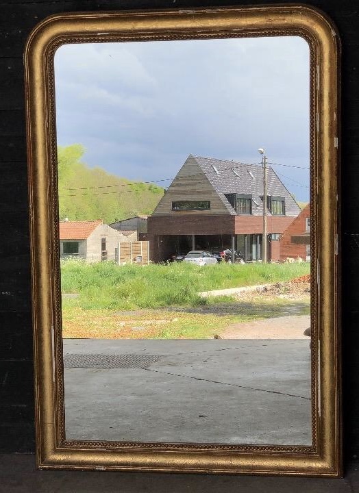 A large and highly decorative French Gilt Wood Mirror. Very good quality, the frame has a rare design to the gilt and the back is very nicely panelled. The frame has some loses and nicks giving it great character.