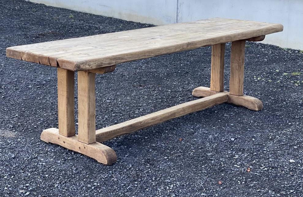 A superb French Solid Oak Farmhouse Refectory Dining Table. Very rustic and loads of character with a great top that is 6cm thick. We have bleached it for a fresh look but could be waxed to any colour/shade desired. Cones apart for easy access into the home. This is a very well constructed table that will be around for generations to come.