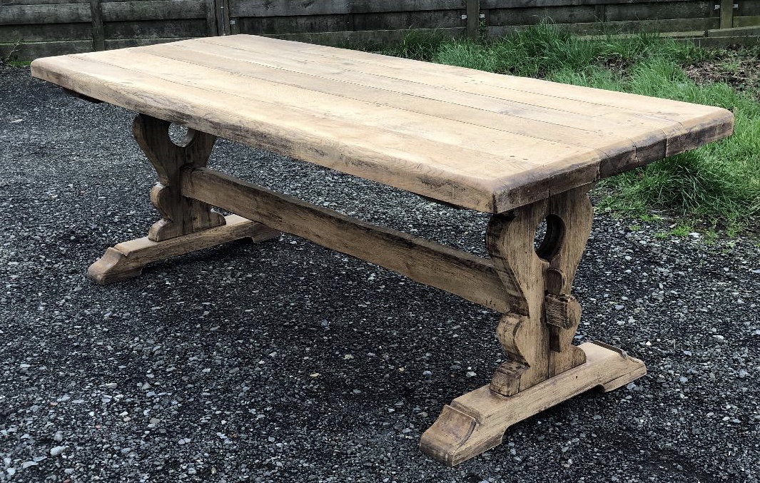 A superb rustic farmhouse refectory dining table, French in origin and made from solid oak with a nice thick top. Dating to the mid 19th Century having peg joints. This table will seat 10 and 12 when needed. We have bleached this table for a fresh look but can of course be waxed to any colour or shade desired.