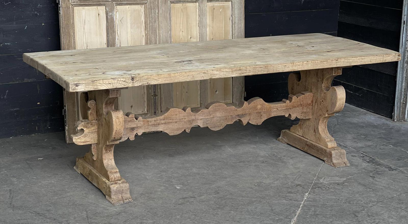 A superb Large Trestle End Rustic Farmhouse Refectory Dining Table. Made of solid oak with a nice thick top. Plenty of character and in excellent original condition for the home.
