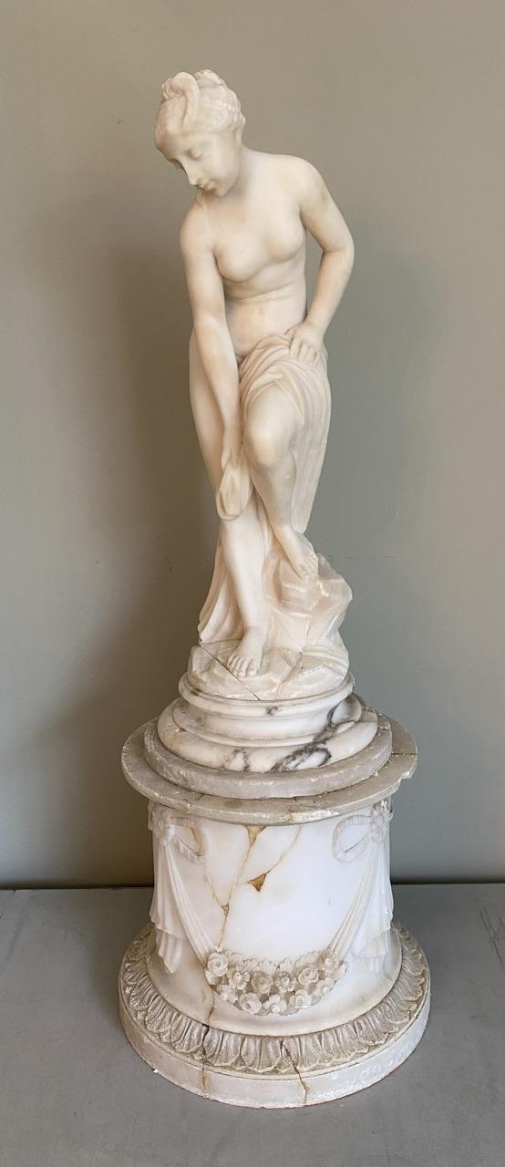 This is a lovely Grand Tour late 19th Century Classical Maiden standing on a separate plinth. Made from Alabaster and well modelled. The main figure in excellent condition, the plinth has a few nibbles see photos, but in overall excellent condition for the home.