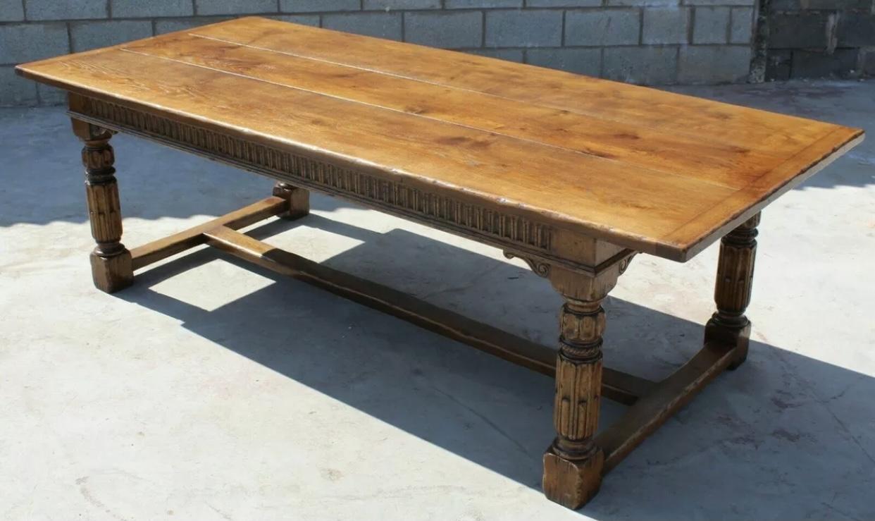 Extremely rare refectory farmhouse dining table being both long and very deep. Made from solid oak and dating to the the early 1900s, excellent quality construction this table will be around for generations to come. Super carved legs and carved freeze and lovely original colour and patina, in overall excellent original condition for the home.