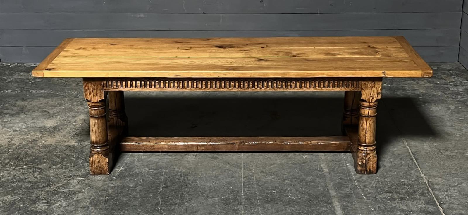 This is an excellent quality solid oak 2.6M farmhouse refectory dining table. Having a desirable 3 plank top and a good depth also. Very good quality construction this table will be around for generations to come.