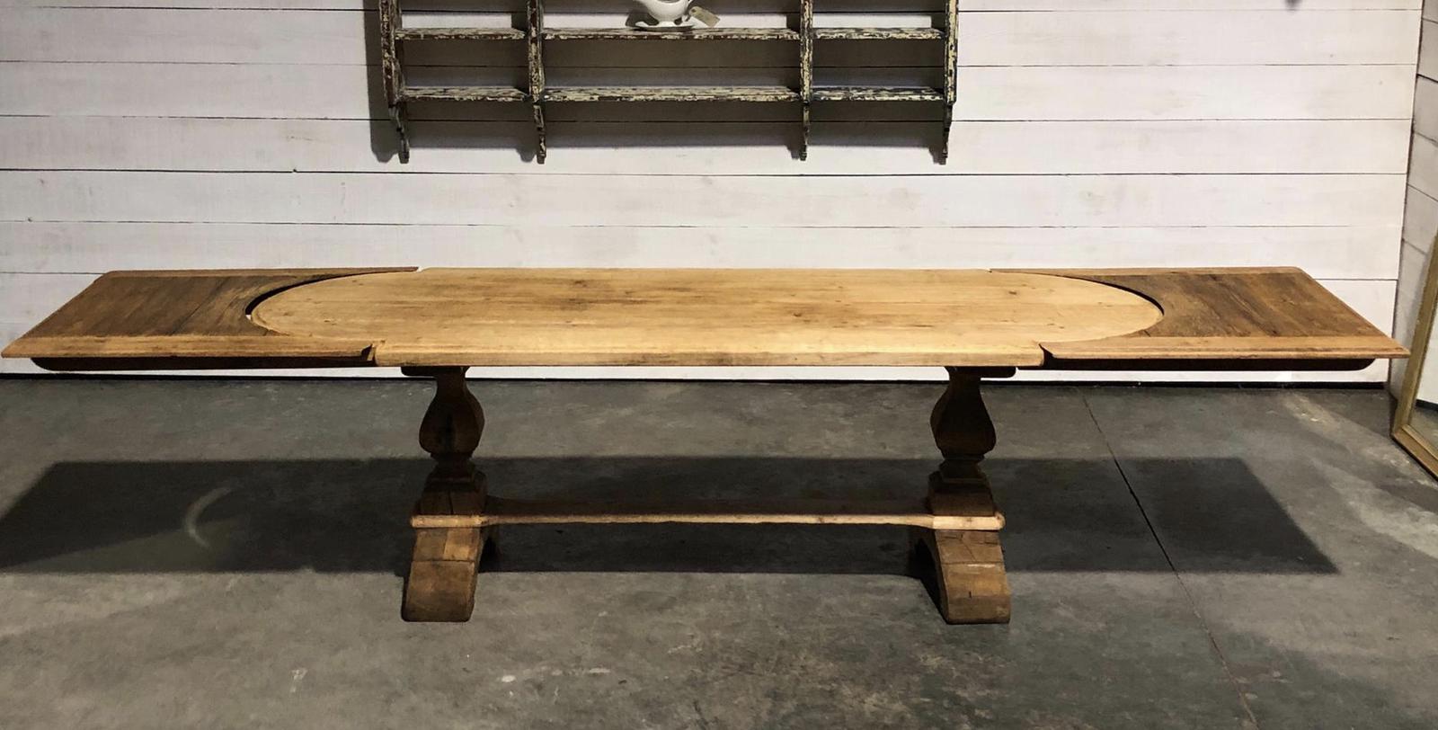 We love this table, very usual design, French in origin made from Solid Oak. The main table is large at 2..21m and would seat 10 but with the extensions its 3.32m and would seat 14. This is a very good quality table and we have bleached it for a fresh look but could be waxed/coloured to any shade desired.