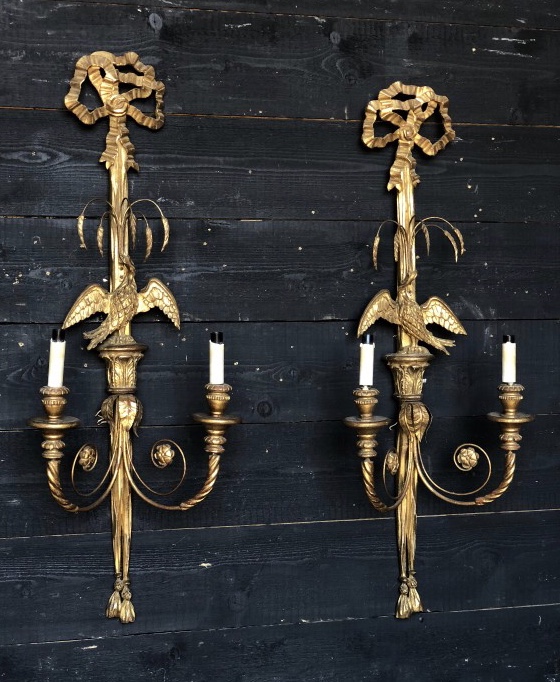 These are a very fine pair of large Wall Lights or Sconces. French in origin and dating to the mid 19th Century. Made from Gesso giltwood, ribbons to the top and a bird to the middle, each has 2 light branches.