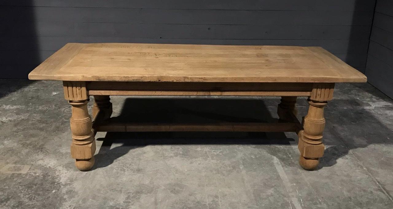 A large French Refectory Farmhouse Dining Table, made from solid Oak in the 1900’s. A very good quality table that will last for generations to come. We have bleached it for a lighter look but could be waxed or coloured to any colour/shade desired. Leg clearance is fine at 60.5 cm and unusually a good deep table.