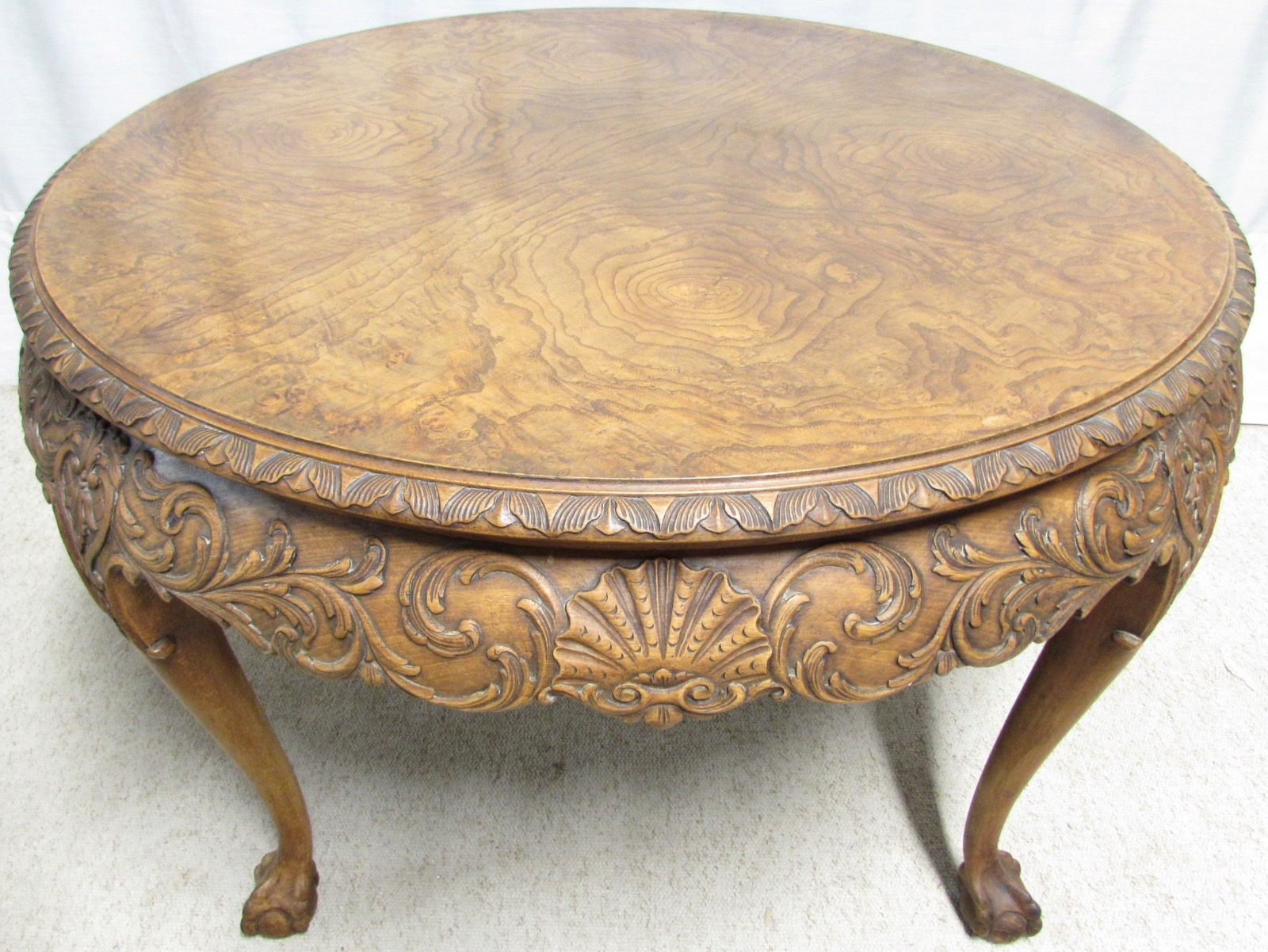 A lovely quality Coffee Table of Large size, made from Solid Walnut with a nice Burr top. The carving decoration is crisp and excellently made.