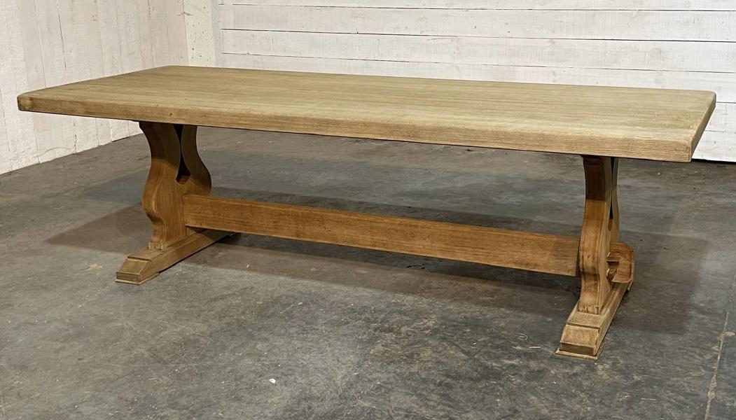 A superb quality and larger size solid oak farmhouse trestle end dining table. Dating to the early 1900s and of excellent quality construction this table will be around for generations to come.