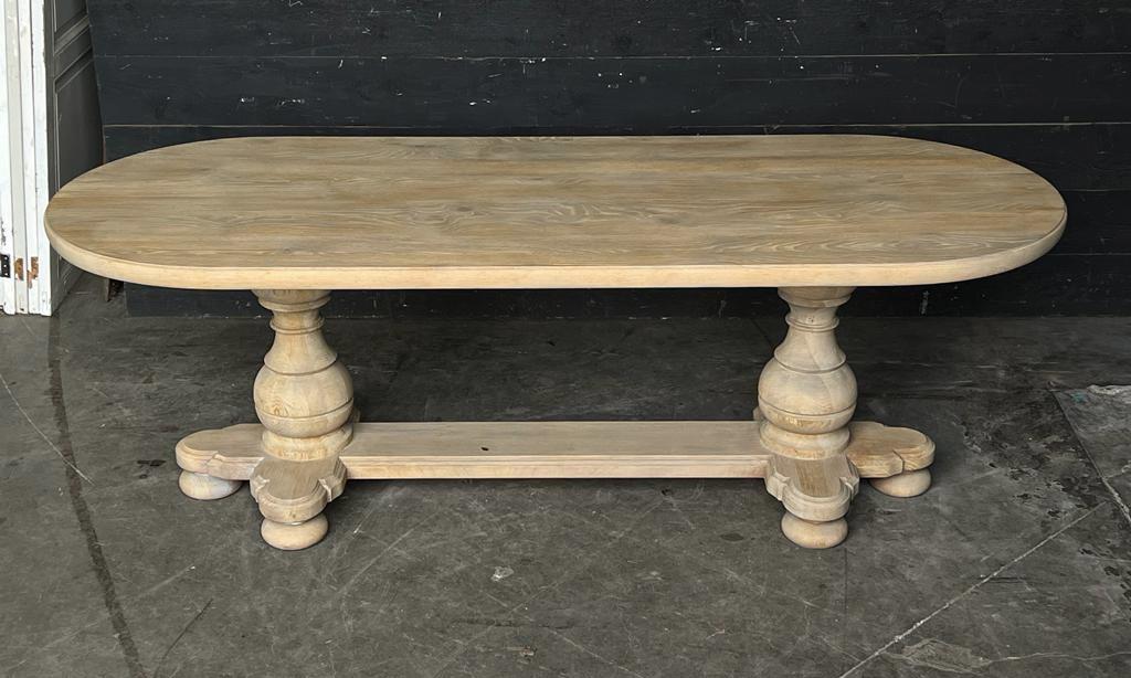 This is a larger than usual with this style, French oak Monastery refectory dining table. Great bases in this style of table and round ends. We have bleached the oak for a lighter look. The top comes off for easy access into the home.
