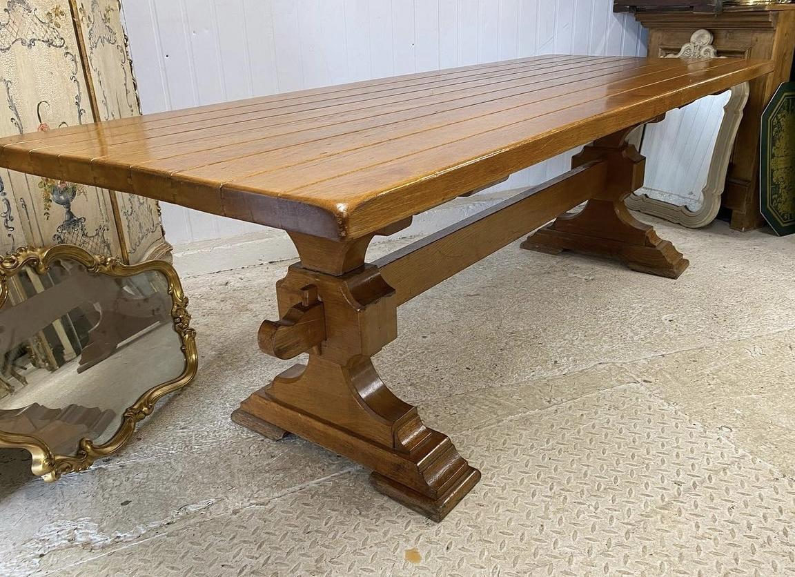 This is a nice French antique trestle farmhouse refectory dining table having lovely warm original colour and patina. A good length and width also, comes apart for easy access into the home. Made from solid oak in the early 1900s this is a good quality table.