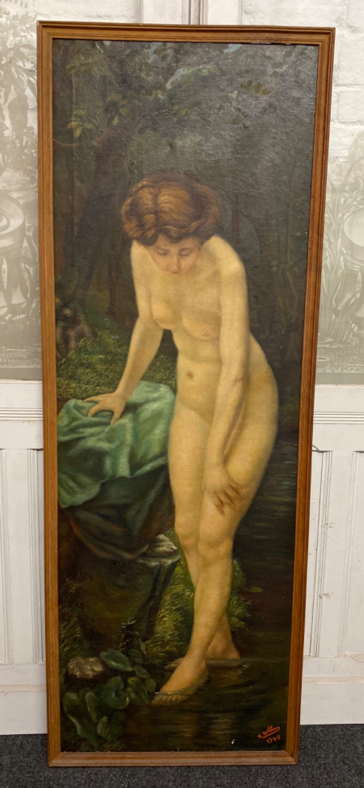 A delightful French original Oil Painting of a Nude on canvas, signed and dated by the artist both on the front and back. Dated 1940.