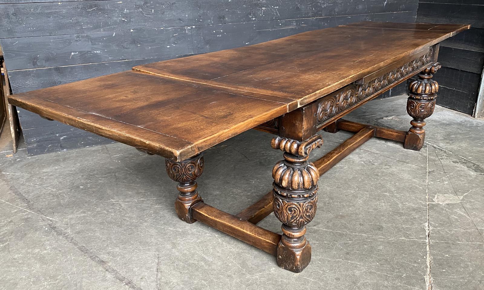 A lovely quality English Oak Dining Table with Extensions that slide out taking it to 3m long. The carved decoration is crisp, the whole table is excellent quality. Has a nice original colour and patina in overall excellent original condition for the home.