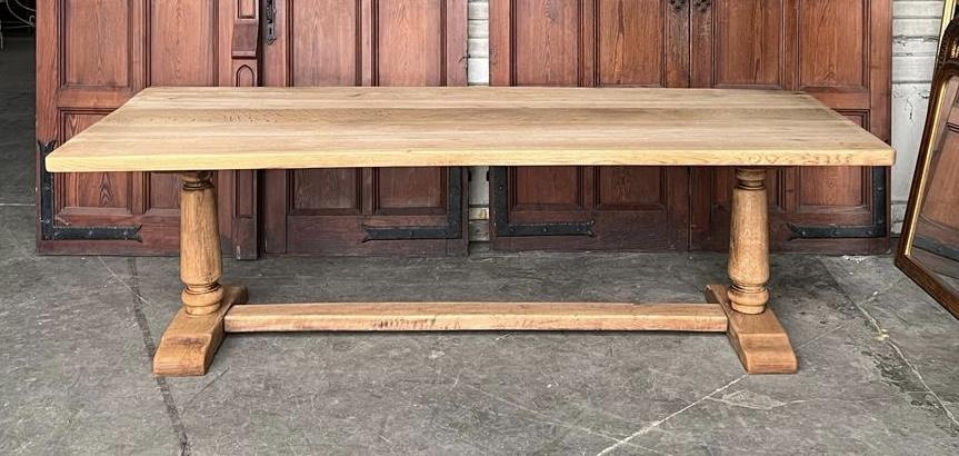 This is a very practical solid oak farmhouse dining table of good length but also good depth which is hard to find. Made in France in the early 1900s of good quality construction. We have bleached it to bring out the natural beauty of the oak. The top does have a little twist but its just character and for a table of this size we have priced it accordingly.