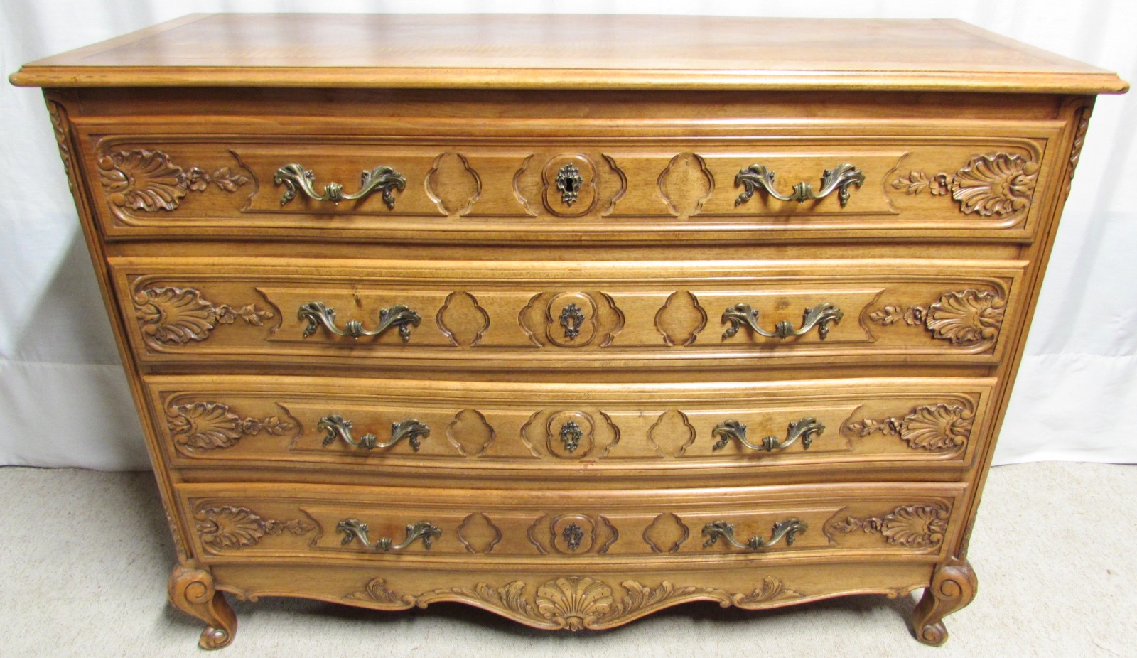 This is a very decorative late 19th Century Victorian French Louis 15th chest of drawers or commode chest. Made from solid Walnut and having smoothly running drawers providing good storage. Lovely French rococo style, carved detail and sitting on little cabriole feet. The chest is slightly serpentine in the front.