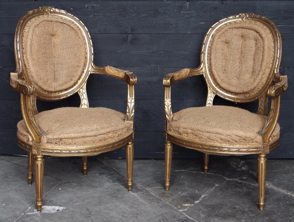 A stunning pair of French armchairs, dating to the late Victorian era and made from giltwood. The frames are strong and sturdy. Very comfortable, the padding is in good condition. They are ready for covering in the fabric of your choice or we have an excellent upholsterer so can have this done.