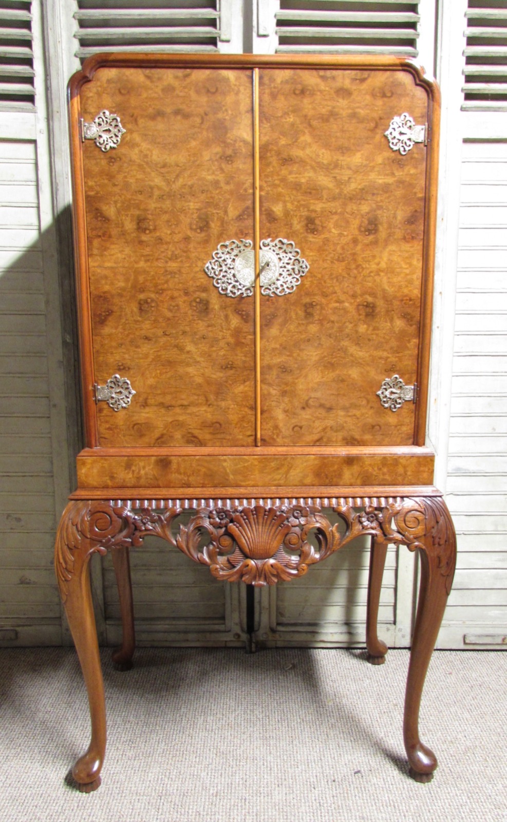 A very nice quality Drinks or Cocktail Cabinet, made from Walnut with excellent Burr Walnut to the front. The carved base is very well done and crisp and carved from solid walnut. The 2 doors open to reveal glass shelves and a mirrored slid that pulls forward to make your drinks on. The doors are lockable (key present) and the lock plate and hinges are another nice feature. She sits on Queen Anne legs.