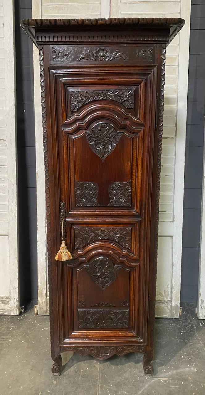This is a really lovely 19th Century armoire made from oak and having its original warm colour and patina. The key is present and lock works. Inside are currently shelves but it could easily be converted to hanging.