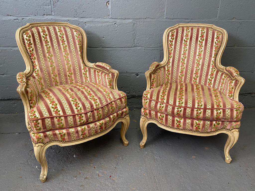 A very comfortable pair of French Bergere Chairs, dating to the 1920’s. The frames are strong and sturdy and in their original finish which has a nice worn patina, the internal upholstery is very good and the seat cushion is comfy. We have left the original fabric in but this is easily taken off ready for you to have upholstered. Seat height 48 cm.
