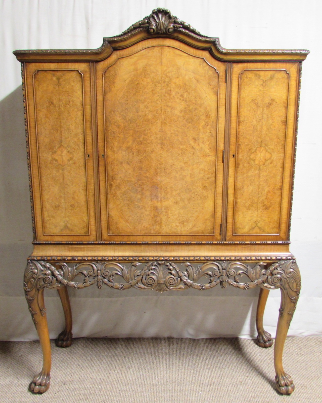A Rolls Royce Cabinet that would have been retailed by of Londons finest retailers such as Maple & Co. The quality is 2nd to none, made from Solid Walnut with excellent tight Burr Walnut to the front and sides. The top has 3 lockable (key present) doors which open to reveal a mahogany interior and 2 shelves in each section. The carved freeze is possible the best I have ever seen, all hand carved would have taken many weeks for a man to carve out of solid Walnut. She sits on shaggy paw feet. She has Queen Anne influences and could be used as a cocktail cabinet if so desired.