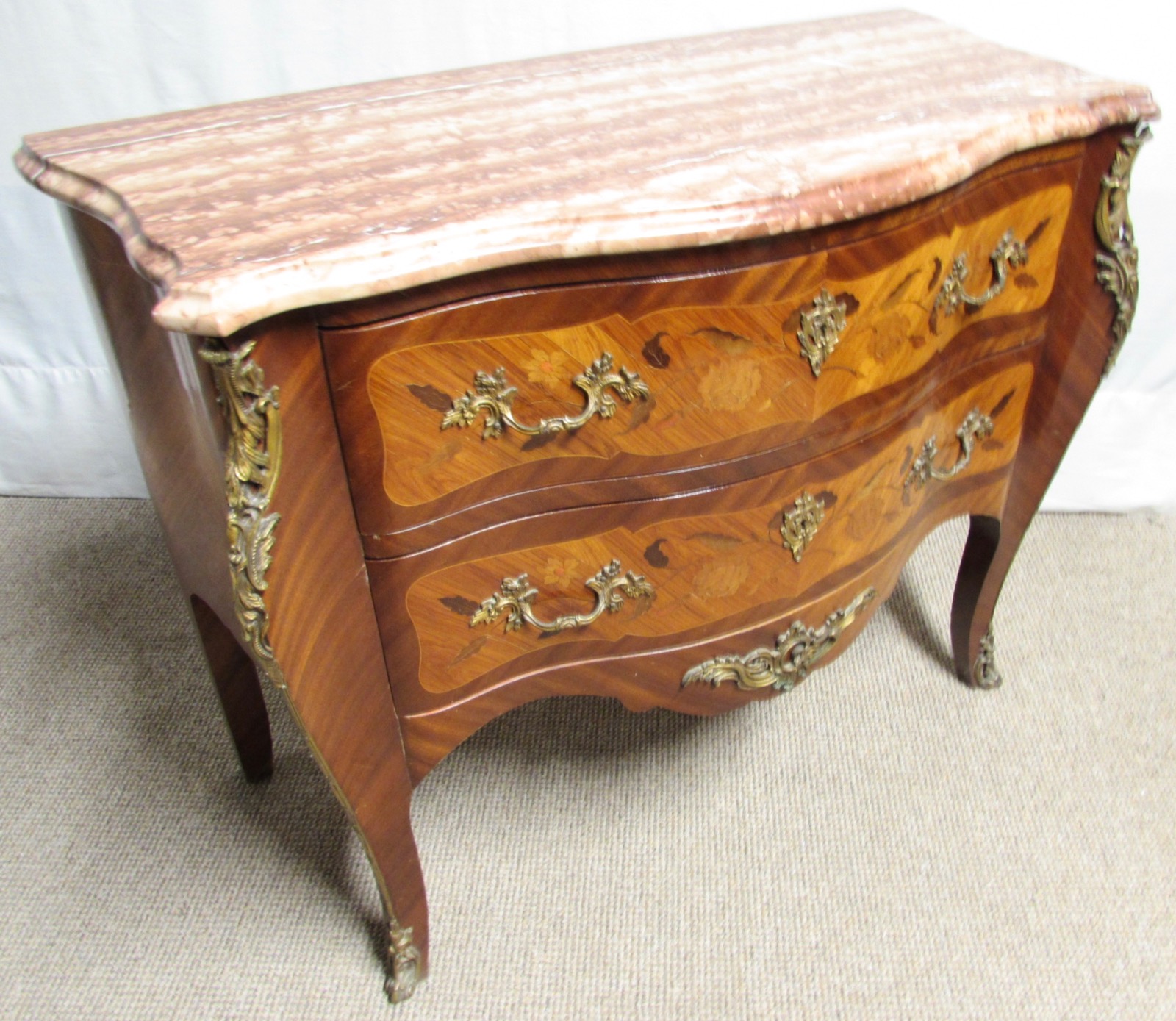 This is an excellent quality French marquetry commode chest of drawers. serpentine and Bombe in form and having 2 drawers which run smoothly. The ormolu mounts and handles are crisp and well cast. The floral Marquetry still retains some original colours of the various woods used. The main chest is Kingwood. The marble top is stunning and in perfect condition.