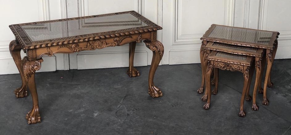 A lovely pair, matching coffee table and nest 3 tables. French in origin, dating to around 1920 and made from Walnut. The tops are cane bergere with glass over. The carving is crisp and well executed and they have ball and claw feet.