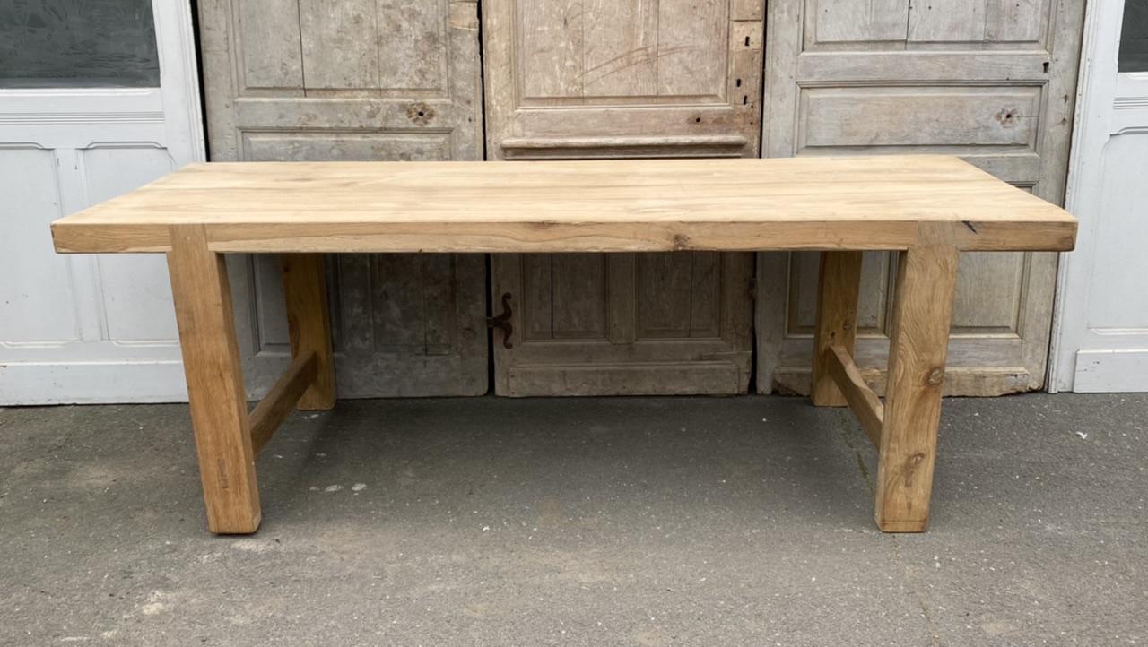 A great Looking Normandy Farmhouse Dining Table having nice clean lines and patina. Made from solid Oak with a 2 plank top which is 7cm thick and very heavy! We have bleached the table for a lighter look which suits the cleaner lines and brings out the beauty of the wood. The table dates to the early 1900s, of excellent quality construction this table will be around for generations to come.