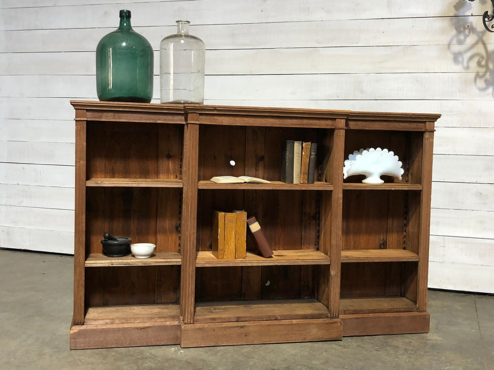 A nice quality oak open bookcase having a breakfront making 3 sections. The shelves are adjustable. In nice original condition with original patina.