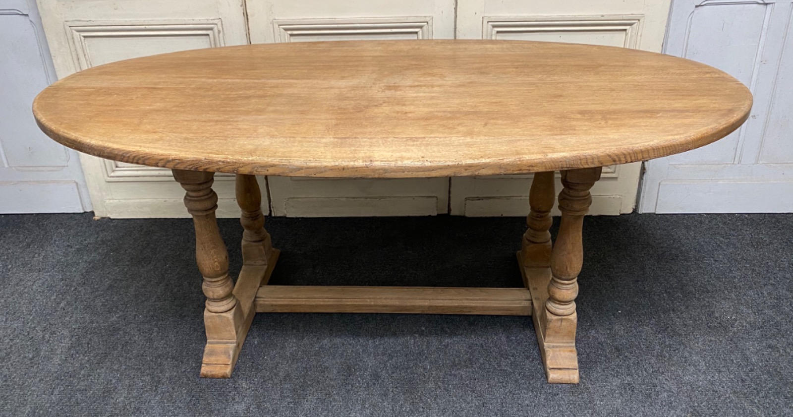 An unusual, being oval, solid oak farmhouse kitchen dining table. We have bleached it for a fresh look but can be waxed to any shade or colour if desired.