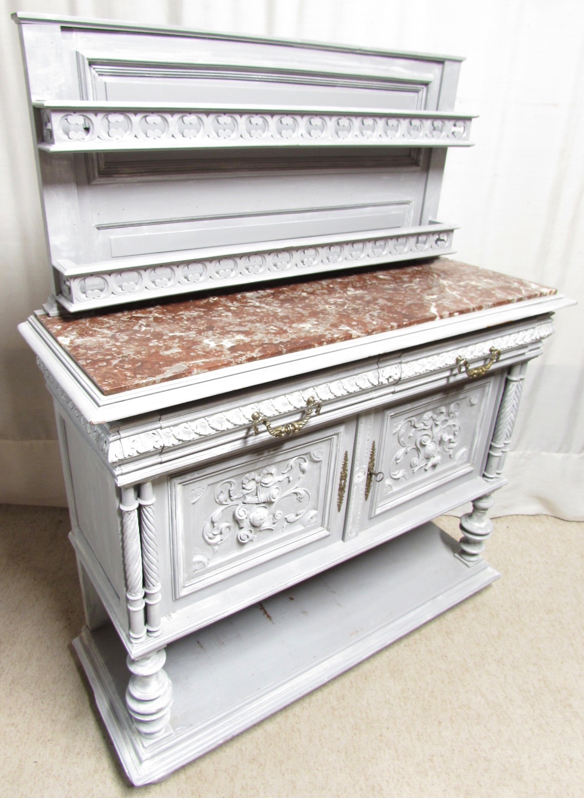 A nice example of a French buffet or Sideboard, made from solid Walnut and crisply carved. The 2 lockable doors (key present) open to provide storage and the 2 drawers above are smoothly sliding. The marble top is in good order and the back comes off for easy movement.
