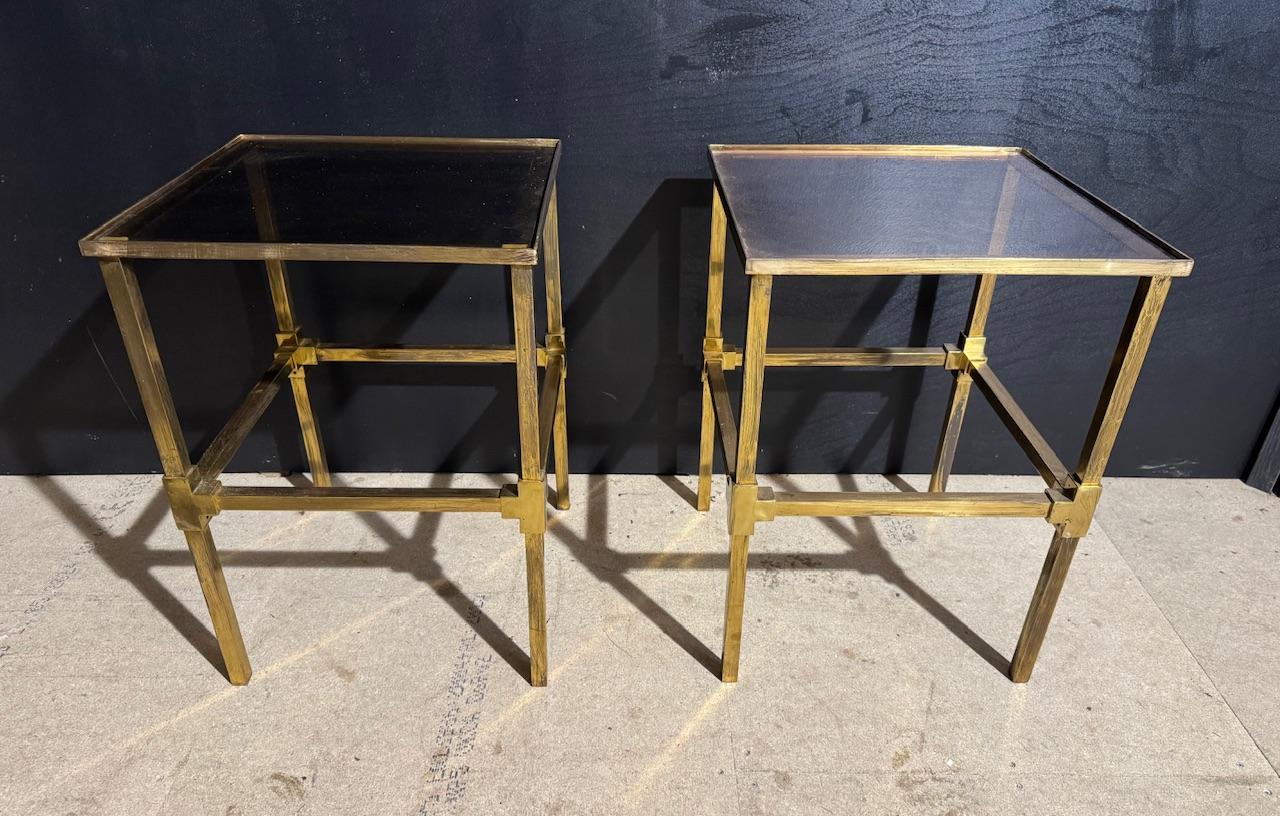 Very good quality pair of brass Lamp Tables with glass tops. They came from Paris and are in very good condition with just some age rubbing.