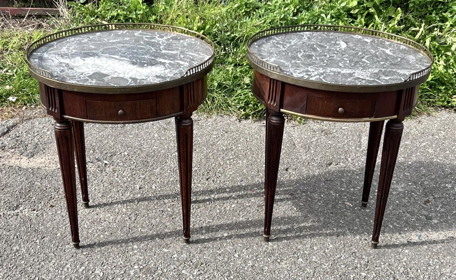 A lovely pair of Louis Xvi bedside or lamp Tables. Very rare being oval in form, made from Mahogany with grey variegated marble tops which are prefect. Each has a single drawer to the front, brass gallery, inset strips and cup feet.