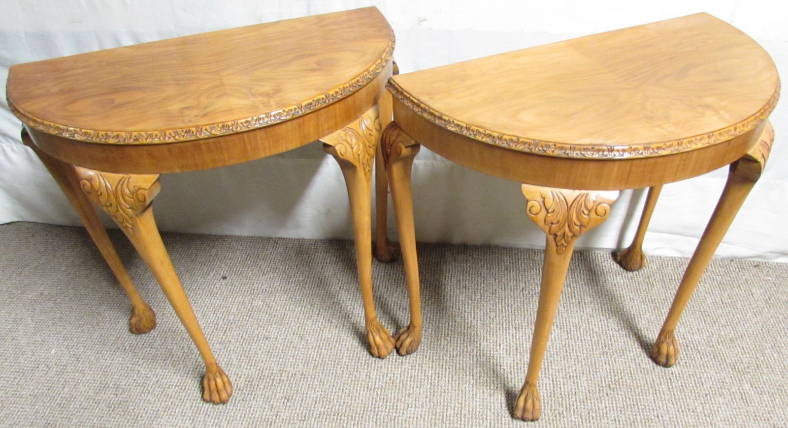 A pretty pair of Console, Lamp or Hall Tables, made from Walnut with Burr Walnut tops. Half round or demi lune in shape and sitting on Queen Anne legs ending with ball and claw feet. They have plate glass tops if required.