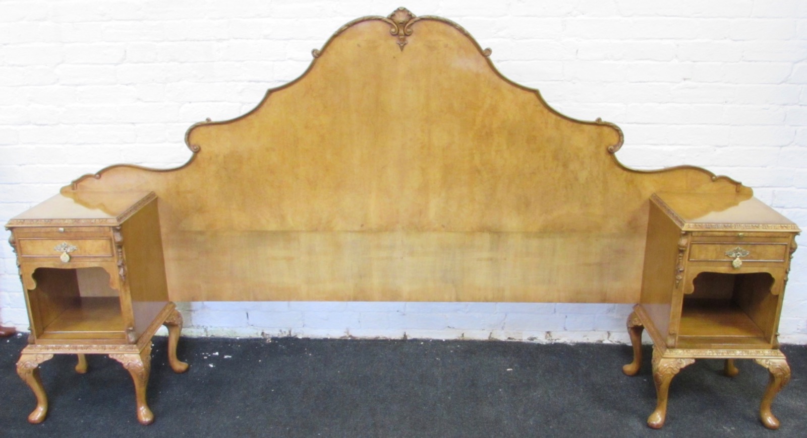 A very high quality Pair Bedsides in Burr Walnut, they come with a large headboard but can be used without if desired. Each having a door and drawer fitted with original handles and sitting on Queen Anne legs.