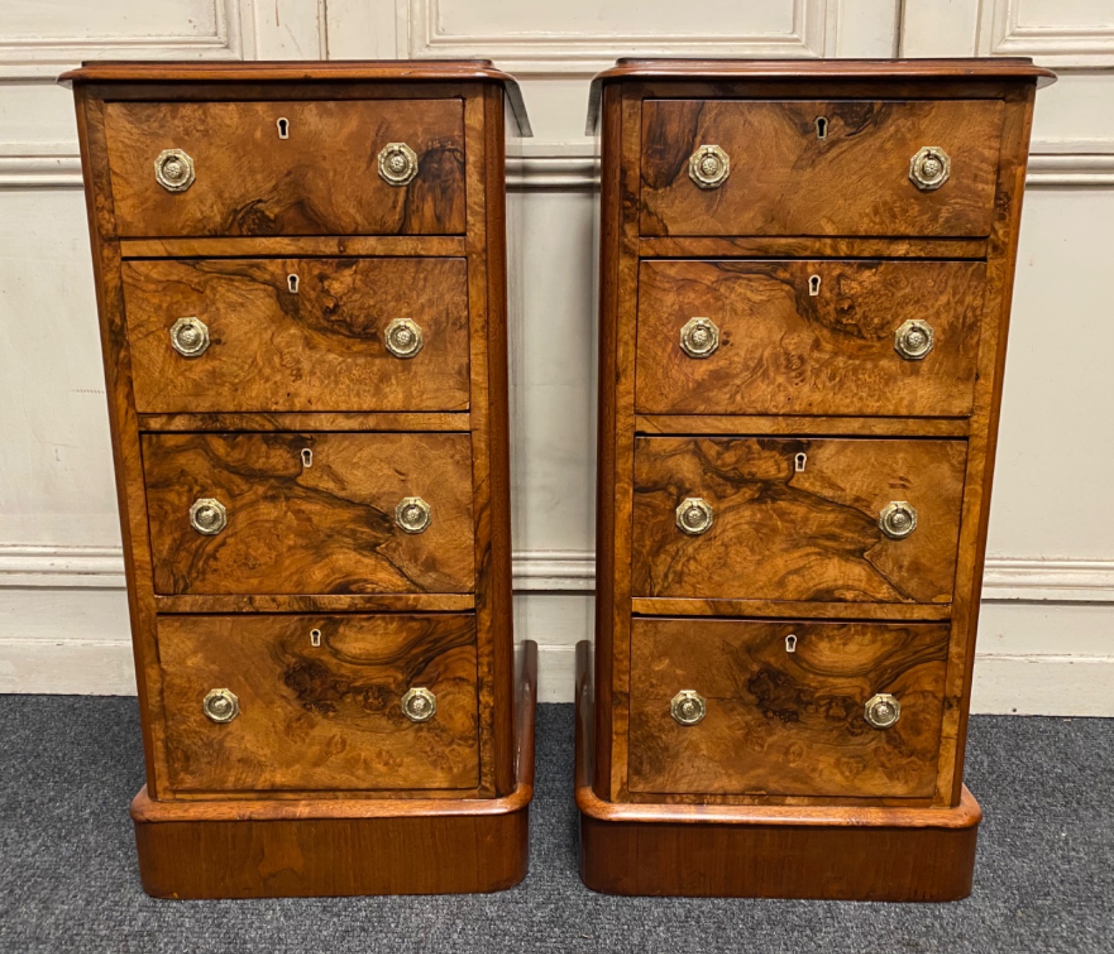 A fine pair of 19th Century Victorian bedside chest of drawers, having lovely burr walnut to the fronts and tops. The drawers all run smoothly and fitted with original brass handles.