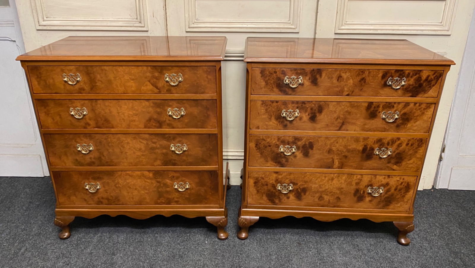 A lovely rare pair of Chest of Drawers, made from walnut with nice burr walnut. All the drawers run smoothly fitted with original handles. They sit on Queen Anne feet. They would also make a good pair of bedside chests for the larger bedroom.